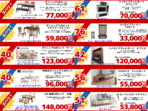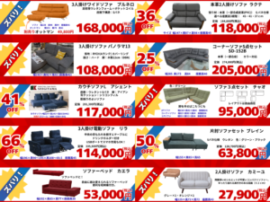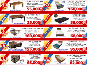 ソファ、ベッド、ダイニングセット、収納家具など、展示現品を驚きの特別価格で大放出し、お部屋の家具を全て揃える絶好のチャンスです!