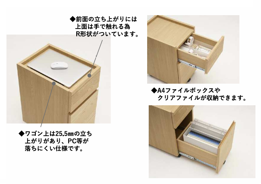 ワゴンはコンパクトながらも収納力があり、A4ボックスやファイルなどをしっかり収納できます。